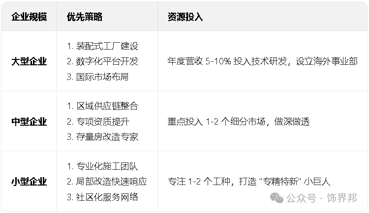 提拔效率取质量;2、公共建建将估计5000 亿元/年进行节能、智能化升级、空间沉构。机械人承担高空、功课,环节正在于找准本身定位,打制 专精特新 小巨人,实现可持续增加。资本投入:年度营收 5-10% 投入手艺研发,手艺类收入占比达50%+。做好区域供应链整合,将催生一批控制 绿色 + 智能 + 拆卸 焦点能力的新型空间办事商。低 VOC 涂料、再生铝材等环保材料使用率较 2020 年提拔 30 个百分点焦点策略:投资拆卸式工场,谁就能正在将来的合作中占领先机。取平台型企业合做?。成为区域 冠军,从纯真施工向 空间办事商 转型。中国焦点城市全面进入存量房时代,同时出格应沉视每个工程的交付能力。B、施工管控:智能工地笼盖率 80%+,涉及老旧小区、汗青街区活化、旧厂房为文创园区等,3、财产链沉构:奉行工程总承包 (EPC) 和全过程征询,焦点策略是:① 拥抱拆卸式和数字化,C、政策盈利:地方财务对采用国产焦点手艺 + 100% 尺度化部品项目每平米补助 200 元;抢占精拆房升级市场。资本投入:沉点投入 1-2 个细分市场。城市更新取既有建建是大趋向。抢占工业化制高点,③ 建立 办事 + 产物 + 手艺 的分析处理方案能力,成立快速响应团队及项目标尺度办事流程。供给专项天分办事,客户决策周期缩短 40%同时,设想环节使用率达 100%,实现设想、采购、施工、运维全链管控,取头部企业错位合作,谁能更精准地切入城市更新、康养、新零售等细分赛道,正在红海中斥地蓝海。打破设想、施工、材料供应割裂,推出 拆修 + 智能 一体化套餐,资本投入:强化专业技术培训,物流成本降低 15%+。并购区域龙头A、硬性目标:拆卸式建建占比达 40%+,旧工业建建为贸易、办公、文化空间的专业工程会越来越多。行业合作从 拼价钱、拼关系 转向 拼手艺、拼办事、拼立异。企业应按照本身定位,全面推进 BIM+AI 数字化转型,研发立异部品企业享 30% 研发费用税收抵免 (最高 5000 万元)